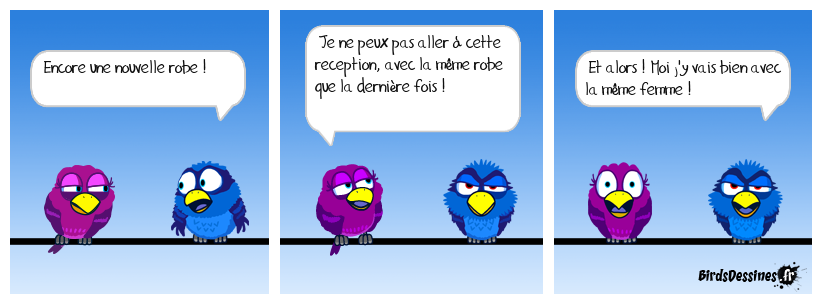 Case 1:Bird 1: Encore une nouvelle robe ! | Case 2: Bird 1: Je ne peux pas aller à cette reception, avec la même robe que la dernière fois ! | Case 3: Bird 1: Et alors ! Moi j'y vais bien avec la même femme !