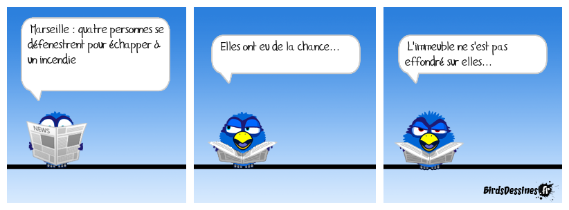 Case 1:Bird 1: Marseille : quatre personnes se défenestrent pour échapper à un incendie | Case 2: Bird 1: Elles ont eu de la chance... | Case 3: Bird 1: L'immeuble ne s'est pas effondré sur elles...