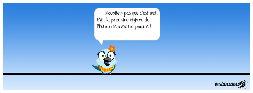 Case 1: | Case 2: Bird 1: N'oubliez pas que c'est moi, EVE, la première végane de l'humanité avec ma pomme ! | Case 3: