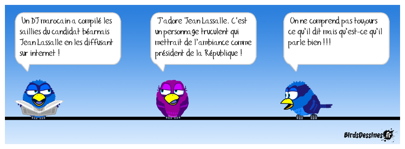 Case 1:Bird 1: Un DJ marocain a compilé les saillies du candidat béarnais Jean Lassalle en les diffusant sur internet ! | Case 2: Bird 1: J’adore Jean Lassalle. C‘est un personnage truculent qui mettrait de l’ambiance comme président de la République ! | Case 3: Bird 1: On ne comprend pas toujours ce qu’il dit mais qu’est-ce qu’il parle bien !!!