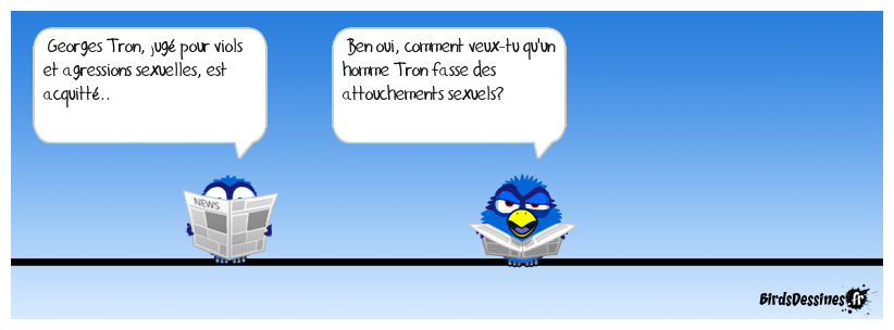 Case 1:Bird 1: Georges Tron, jugé pour viols et agressions sexuelles, est acquitté.. | Case 2: Bird 1: Ben oui, comment veux-tu qu'un homme Tron fasse des attouchements sexuels? | Case 3: