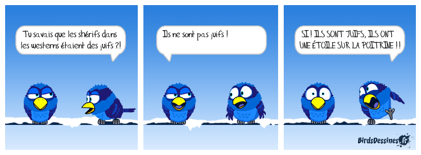 Case 1:Bird 1: Tu savais que les shérifs dans les westerns étaient des juifs ?! | Case 2: Bird 1: Ils ne sont pas juifs ! | Case 3: Bird 1: SI ! ILS SONT JUIFS, ILS ONT UNE ÈTOILE SUR LA POITRINE !!
