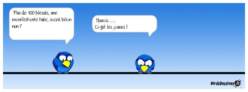 Case 1:Bird 1: Plus de 100 blessés, une manifestante tuée, sacré bilan non ? | Case 2: Bird 1: Mouais..... Ci-git les jaunes ! | Case 3: