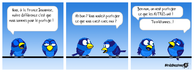 Case 1:Bird 1: Nous, à la France Insoumise, notre différence c'est que nous sommes pour le partage ! | Case 2: Bird 1: Ah bon ? Vous voulez partager ce que vous avez avec moi ? | Case 3: Bird 1: Ben non, on veut partager ce que les AUTRES ont ! Bird 2: Tu m'étonnes..!