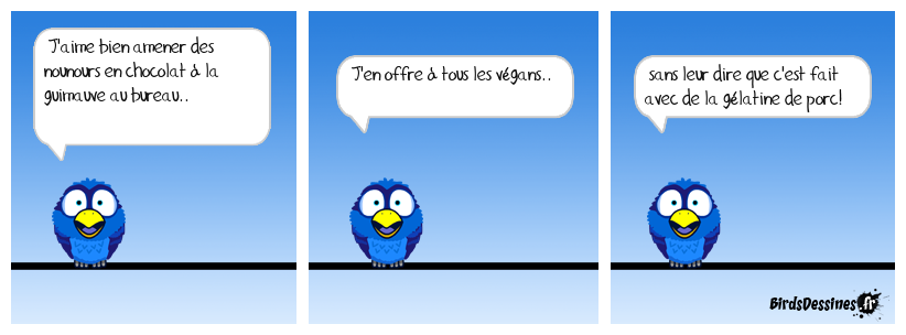 Case 1:Bird 1: J'aime bien amener des nounours en chocolat à la guimauve au bureau.. | Case 2: Bird 1: J'en offre à tous les végans.. | Case 3: Bird 1: sans leur dire que c'est fait avec de la gélatine de porc!