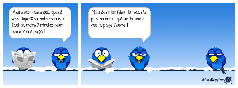 Case 1:Bird 1: Vous avez remarqué, quand vous cliquez sur votre souris, il faut au moins 3 minutes pour ouvrir votre page ! | Case 2: Bird 1: Mais dans les films, le mec n'a pas encore cliqué sur la souris que la page s'ouvre ! | Case 3: