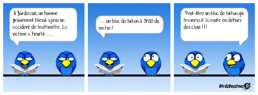 Case 1:Bird 1: À Bordeaux, un homme grièvement blessé après un accident de trottinette. La victime a heurté ..... | Case 2: Bird 1: ....un bloc de béton à 3h30 du matin ! | Case 3: Bird 1: Peut-être un bloc de béton qui traversait la route en dehors des clous !!!