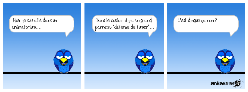 Case 1:Bird 1: Hier je suis allé dans un crématorium.... | Case 2: Bird 1: Dans le couloir il y a un grand panneau "défense de fumer"... | Case 3: Bird 1: C'est dingue ça non ?