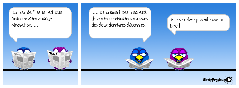 Case 1:Bird 1: La tour de Pise se redresse. Grâce aux travaux de rénovation,.... | Case 2: Bird 1: ....le monument s'est redressé de quatre centimètres au cours des deux dernières décennies. | Case 3: Bird 1: Elle se relève plus vite que ta bite !