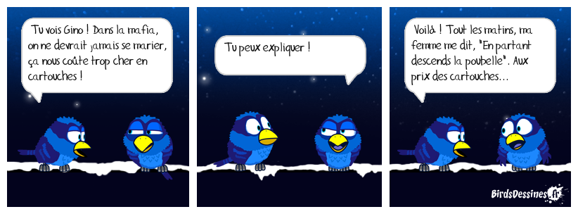 Case 1:Bird 1: Tu vois Gino ! Dans la mafia, on ne devrait jamais se marier, ça nous coûte trop cher en cartouches ! | Case 2: Bird 1: Tu peux expliquer ! | Case 3: Bird 1: Voilà ! Tout les matins, ma femme me dit, "En partant descends la poubelle". Aux prix des cartouches...