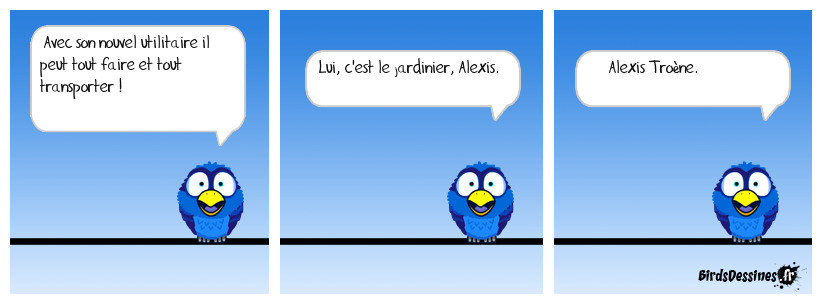 Case 1:Bird 1: Avec son nouvel utilitaire il peut tout faire et tout transporter ! | Case 2: Bird 1: Lui, c'est le jardinier, Alexis. | Case 3: Bird 1: Alexis Troène.