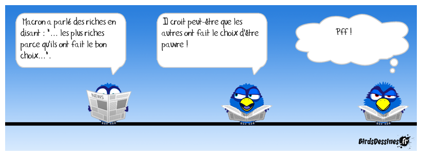 Case 1:Bird 1: Macron a parlé des riches en disant : "... les plus riches parce qu'ils ont fait le bon choix...". | Case 2: Bird 1: Il croit peut-être que les autres ont fait le choix d'être pauvre ! | Case 3: Bird 1: Pff !
