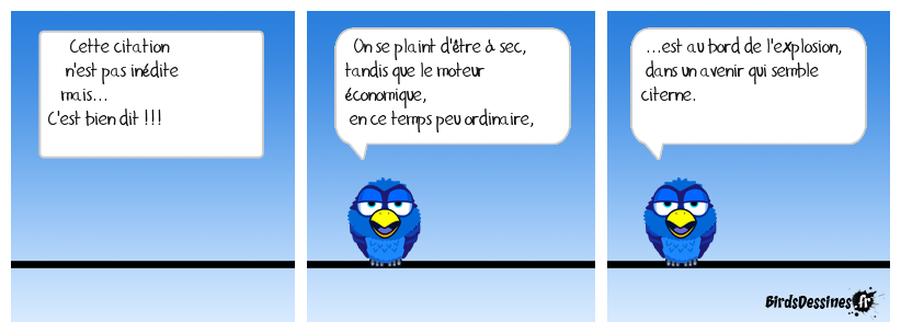 Case 1:Bird 1: Cette citation n'est pas inédite mais... C'est bien dit !!! | Case 2: Bird 1: On se plaint d'être à sec, tandis que le moteur économique, en ce temps peu ordinaire, | Case 3: Bird 1: ...est au bord de l'explosion, dans un avenir qui semble citerne.