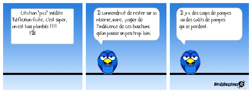Case 1:Bird 1: Citation "pas" inédite Réflexion faite, c'est super, on est tous plombés !!!! FIN | Case 2: Bird 1: Il conviendrait de rester sur sa réserve,voire, jauger de l'indécence de ces bouchons qu'on pousse un peu trop loin. | Case 3: Bird 1: Il y a des coups de pompes ou des coûts de pompes qui se perdent.
