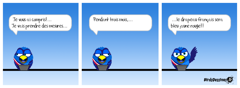 Case 1:Bird 1: Je vous ai compris!... Je vais prendre des mesures... | Case 2: Bird 1: Pendant trois mois,... | Case 3: Bird 1: ...le drapeau français sera bleu jaune rouge!!