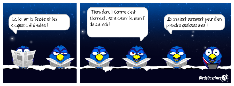 Case 1:Bird 1: La loi sur la fessée et les claques a été votée ! | Case 2: Bird 1: Tiens donc ! Comme c'est étonnant, juste avant la manif de samedi ! | Case 3: Bird 1: Ils avaient surement peur d'en prendre quelques unes !