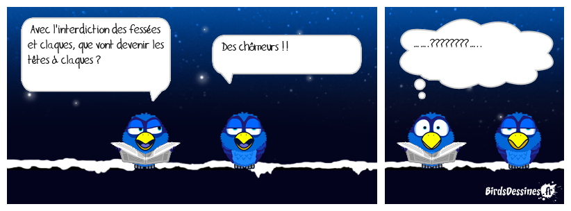 Case 1:Bird 1: Avec l'interdiction des fessées et claques, que vont devenir les têtes à claques ? | Case 2: Bird 1: Des chômeurs !! | Case 3: Bird 1: …….????????…..
