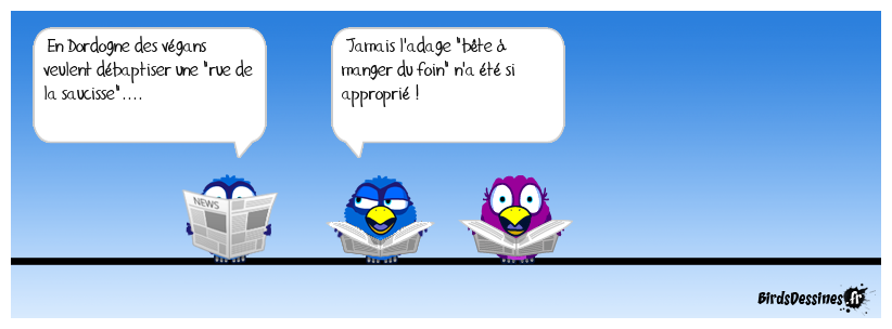 Case 1:Bird 1: En Dordogne des végans veulent débaptiser une "rue de la saucisse".... | Case 2: Bird 1: Jamais l'adage "bête à manger du foin" n'a été si approprié ! | Case 3: