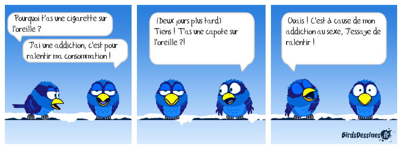Case 1:Bird 1: Pourquoi t'as une cigarette sur l'oreille ?Bird 2: J'ai une addiction, c'est pour ralentir ma consommation ! | Case 2: Bird 1: (Deux jours plus tard) Tiens ! T'as une capote sur l'oreille ?! | Case 3: Bird 1: Ouais ! C'est à cause de mon addiction au sexe, J'essaye de ralentir !