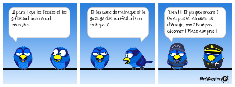 Case 1:Bird 1: Il parait que les fessées et les gifles sont maintenant interdites... | Case 2: Bird 1: Et les coups de matraque et le gazage des manifestants on fait quoi ? | Case 3: Bird 1: Rien !!! Et pis quoi encore ? On va pas se retrouver au chômage, non ? Faut pas déconner ! Place aux pros !