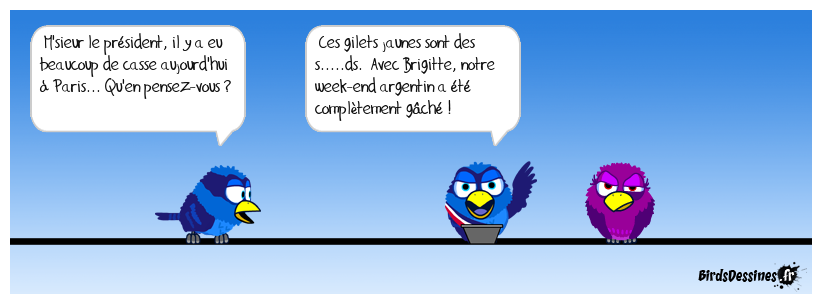 Case 1:Bird 1: M'sieur le président, il y a eu beaucoup de casse aujourd'hui à Paris... Qu'en pensez-vous ? | Case 2: Bird 1: Ces gilets jaunes sont des s.....ds. Avec Brigitte, notre week-end argentin a été complètement gâché ! | Case 3: