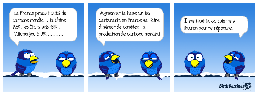 Case 1:Bird 1: La France produit 0.9% du carbone mondial , la Chine 28%, les Ètats-unis 15% , l’Allemagne 2.3%........... | Case 2: Bird 1: Augmenter la taxe sur les carburants en France va faire diminuer de combien la production de carbone mondial | Case 3: Bird 1: Il me faut la calculette à Macron pour te répondre.