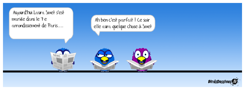 Case 1:Bird 1: Aujourd'hui Laura Smet s'est mariée dans le 7 e arrondissement de Paris.... | Case 2: Bird 1: Ah ben c'est parfait ! Ce soir elle aura quelque chose à Smet ! | Case 3: