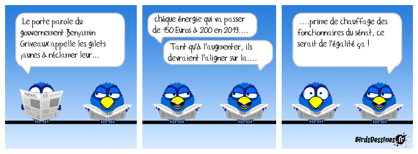 Case 1:Bird 1: Le porte parole du gouvernement Benjamin Griveaux appelle les gilets jaunes à réclamer leur... | Case 2: Bird 1: chèque énergie qui va passer de 150 Euros à 200 en 2019.... Bird 2: Tant qu'à l'augmenter, ils devraient l'aligner sur la.... | Case 3: Bird 1: ....prime de chauffage des fonctionnaires du sénat, ce serait de l'égalité ça !