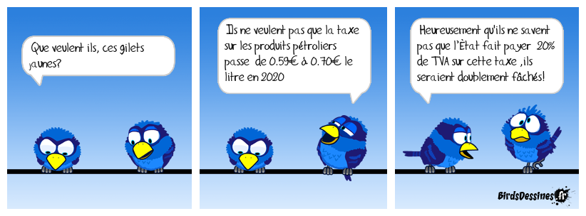 Case 1:Bird 1: Que veulent ils, ces gilets jaunes? | Case 2: Bird 1: Ils ne veulent pas que la taxe sur les produits pétroliers passe de 0.59€ à 0.70€ le litre en 2020 | Case 3: Bird 1: Heureusement qu'ils ne savent pas que l’État fait payer 20% de TVA sur cette taxe ,ils seraient doublement fâchés!