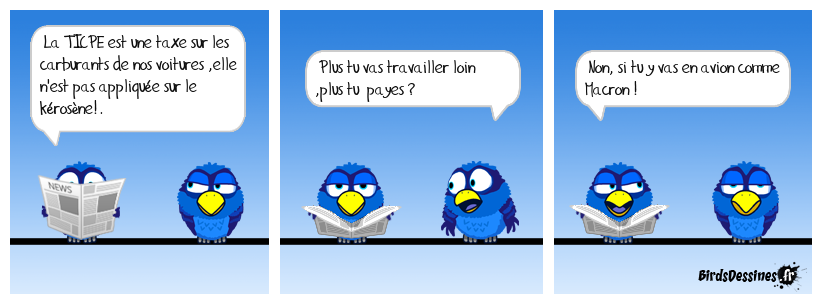 Case 1:Bird 1: La TICPE est une taxe sur les carburants de nos voitures ,elle n'est pas appliquée sur le kérosène!. | Case 2: Bird 1: Plus tu vas travailler loin ,plus tu payes ? | Case 3: Bird 1: Non, si tu y vas en avion comme Macron !