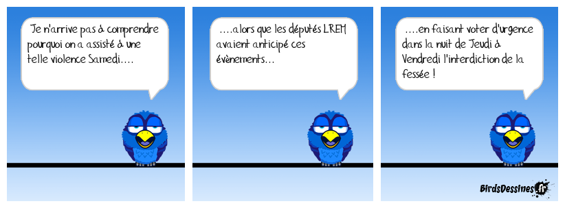 Case 1:Bird 1: Je n'arrive pas à comprendre pourquoi on a assisté à une telle violence Samedi.... | Case 2: Bird 1: ....alors que les députés LREM avaient anticipé ces évènements... | Case 3: Bird 1: ....en faisant voter d'urgence dans la nuit de Jeudi à Vendredi l'interdiction de la fessée !