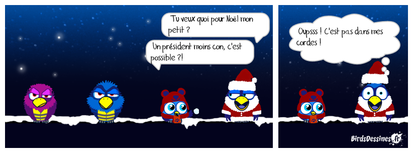 Case 1: | Case 2: Bird 1: Tu veux quoi pour Noël mon petit ? Bird 2: Un président moins con, c'est possible ?! | Case 3: Bird 1: Oupsss ! C'est pas dans mes cordes !