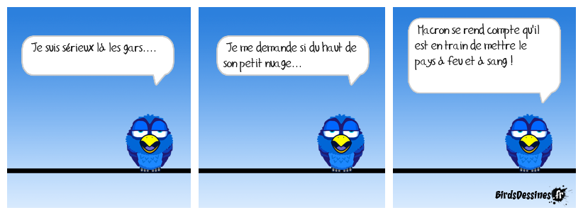 Case 1:Bird 1: Je suis sérieux là les gars.... | Case 2: Bird 1: Je me demande si du haut de son petit nuage... | Case 3: Bird 1: Macron se rend compte qu'il est en train de mettre le pays à feu et à sang !