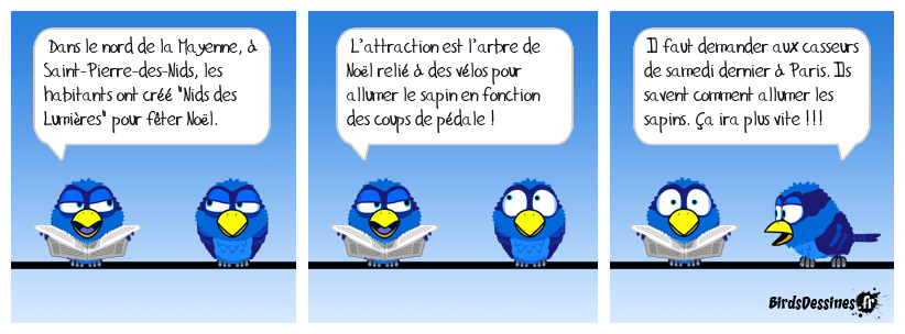 Case 1:Bird 1: Dans le nord de la Mayenne, à Saint-Pierre-des-Nids, les habitants ont créé "Nids des Lumières" pour fêter Noël. | Case 2: Bird 1: L’attraction est l’arbre de Noël relié à des vélos pour allumer le sapin en fonction des coups de pédale ! | Case 3: Bird 1: Il faut demander aux casseurs de samedi dernier à Paris. Ils savent comment allumer les sapins. Ça ira plus vite !!!