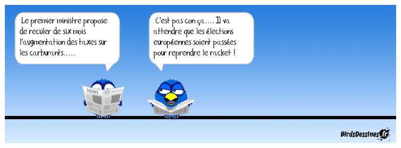 Case 1:Bird 1: Le premier ministre propose de reculer de six mois l'augmentation des taxes sur les carburants..... | Case 2: Bird 1: C'est pas con ça.... Il va attendre que les élections européennes soient passées pour reprendre le racket ! | Case 3:
