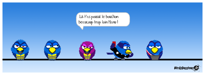 Case 1: | Case 2: Bird 1: Là t'as poussé le bouchon beaucoup trop loin Manu ! | Case 3: