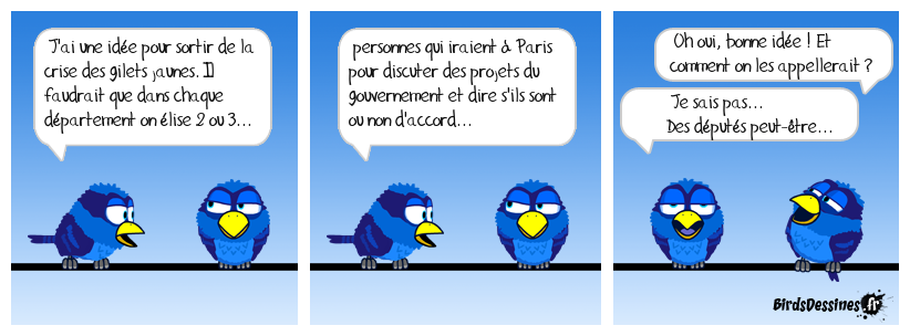 Case 1:Bird 1: J'ai une idée pour sortir de la crise des gilets jaunes. Il faudrait que dans chaque département on élise 2 ou 3... | Case 2: Bird 1: personnes qui iraient à Paris pour discuter des projets du gouvernement et dire s'ils sont ou non d'accord... | Case 3: Bird 1: Oh oui, bonne idée ! Et comment on les appellerait ? Bird 2: Je sais pas... Des députés peut-être...