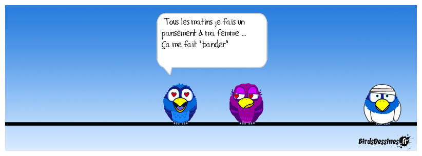 Case 1: | Case 2: Bird 1: Tous les matins je fais un pansement à ma femme … Ça me fait "bander" | Case 3: