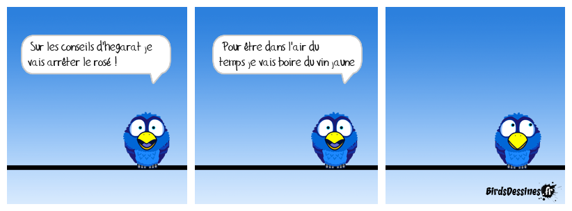 Case 1:Bird 1: Sur les conseils d'hegarat je vais arrêter le rosé ! | Case 2: Bird 1: Pour être dans l'air du temps je vais boire du vin jaune ! | Case 3: