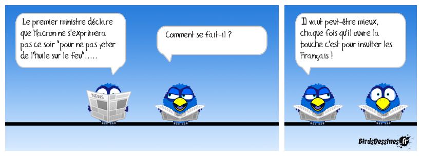 Case 1:Bird 1: Le premier ministre déclare que Macron ne s'exprimera pas ce soir "pour ne pas jeter de l'huile sur le feu"..... | Case 2: Bird 1: Comment se fait-il ? | Case 3: Bird 1: Il vaut peut-être mieux, chaque fois qu'il ouvre la bouche c'est pour insulter les Français !