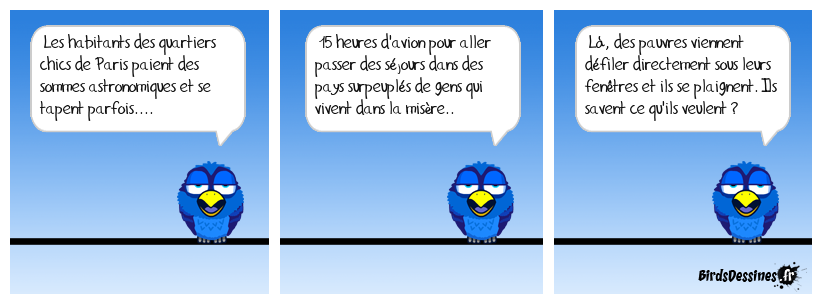 Case 1:Bird 1: Les habitants des quartiers chics de Paris paient des sommes astronomiques et se tapent parfois.... | Case 2: Bird 1: 15 heures d'avion pour aller passer des séjours dans des pays surpeuplés de gens qui vivent dans la misère.. | Case 3: Bird 1: Là, des pauvres viennent défiler directement sous leurs fenêtres et ils se plaignent. Ils savent ce qu'ils veulent ?