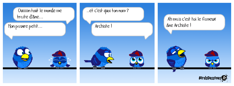 Case 1:Bird 1: Ouiiiiin tout le monde me traite d'âne...Bird 2: Mon pauvre petit... | Case 2: Bird 1: ..et c'est quoi ton nom ? Bird 2: Archiste ! | Case 3: Bird 1: Ah mais c'est toi le fameux âne Archiste !