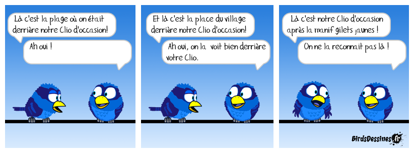 Case 1:Bird 1: Là c'est la plage où on était derrière notre Clio d'occasion!Bird 2: Ah oui ! | Case 2: Bird 1: Et là c'est la place du village derrière notre Clio d'occasion! Bird 2: Ah oui, on la voit bien derrière votre Clio. | Case 3: Bird 1: Là c'est notre Clio d'occasion après la manif gilets jaunes ! Bird 2: On ne la reconnait pas là !