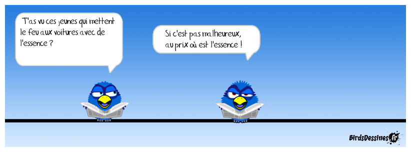 Case 1:Bird 1: T'as vu ces jeunes qui mettent le feu aux voitures avec de l'essence ? | Case 2: Bird 1: Si c'est pas malheureux, au prix où est l'essence ! | Case 3: