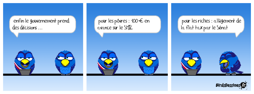 Case 1:Bird 1: enfin le gouvernement prend des décisions ... | Case 2: Bird 1: pour les pôvres : 100 € en avance sur le SMIC | Case 3: Bird 1: pour les riches : allègement de la flat tax par le Sénat