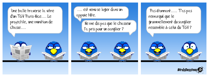 Case 1:Bird 1: Une balle traverse la vitre d'un TGV Paris-Nice.... Le projectile, une munition de chasse.... | Case 2: Bird 1: .... est venu se loger dans un appuie tête. Bird 2: Ne me dis pas que le chasseur l'a pris pour un sanglier ? | Case 3: Bird 1: Pas étonnant..... T'as pas remarqué que le grommellement du sanglier ressemble à celui du TGV ?