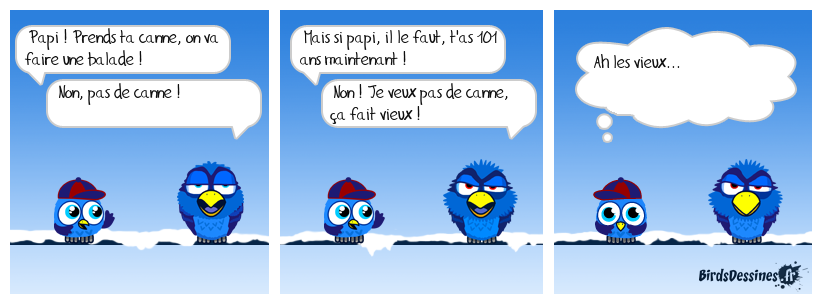 Case 1:Bird 1: Papi ! Prends ta canne, on va faire une balade !Bird 2: Non, pas de canne ! | Case 2: Bird 1: Mais si papi, il le faut, t'as 101 ans maintenant ! Bird 2: Non ! Je veux pas de canne, ça fait vieux ! | Case 3: Bird 1: Ah les vieux...