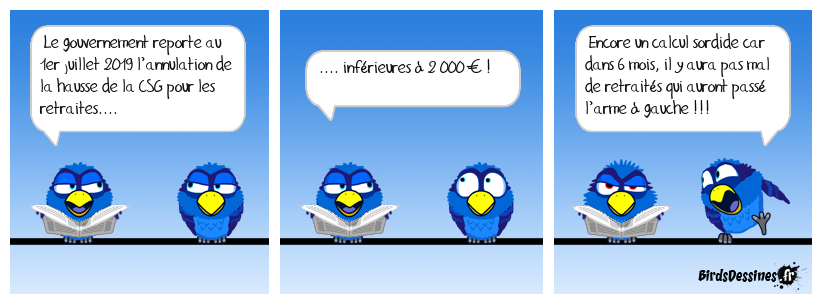 Case 1:Bird 1: Le gouvernement reporte au 1er juillet 2019 l’annulation de la hausse de la CSG pour les retraites.... | Case 2: Bird 1: .... inférieures à 2 000 € ! | Case 3: Bird 1: Encore un calcul sordide car dans 6 mois, il y aura pas mal de retraités qui auront passé l’arme à gauche !!!