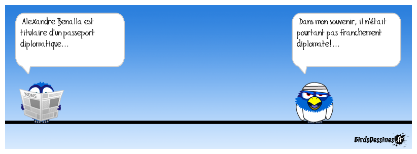 Case 1:Bird 1: Alexandre Benalla est titulaire d'un passeport diplomatique... | Case 2: | Case 3: Bird 1: Dans mon souvenir, il n'était pourtant pas franchement diplomate!...