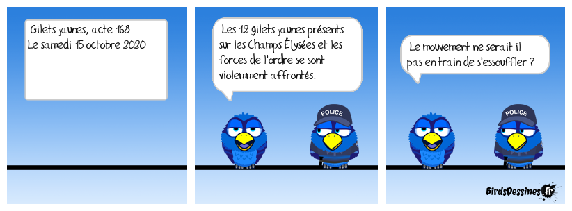 Case 1:Bird 1: Gilets jaunes, acte 168 Le samedi 15 octobre 2020 | Case 2: Bird 1: Les 12 gilets jaunes présents sur les Champs Êlysées et les forces de l'ordre se sont violemment affrontés. | Case 3: Bird 1: Le mouvement ne serait il pas en train de s'essouffler ?